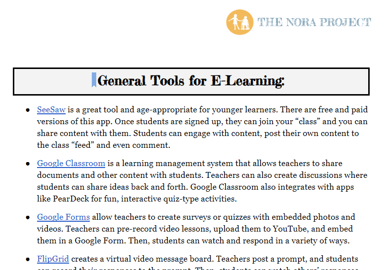 Most of all, we’re continuing to connect with our teachers and our new homeschool teachers - parents - and provide them with suggestions about how to help their students remain connected to one another. When we do, we hear amazing stories about what people are doing to keep kids engaged in social/emotional learning. One week we heard from a teacher who assembled and hand-delivered activity bags with items to help her students reflect on their Nora Project experience this year. At another school, teachers organized a letter-writing campaign so that every Nora Friend would receive a letter every single day. Overall, we’re receiving excellent feedback from our teachers about the speed of our response and the quality of activities and resources we provide. We’re thrilled to be able to support teachers and students during this unprecedented time by creating and providing resources, but also by being on call for our participants to assist with lesson creation, problem solving, and brainstorming.
